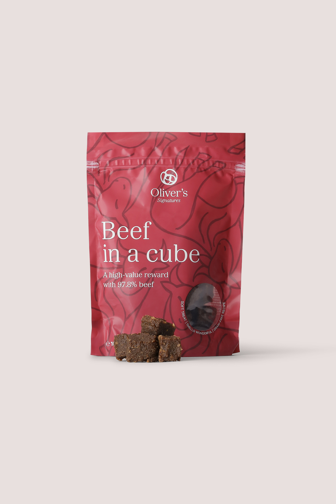 En blød, kornfri godbid med hele 97,8% okse. Den fungerer fantastisk som en belønning.